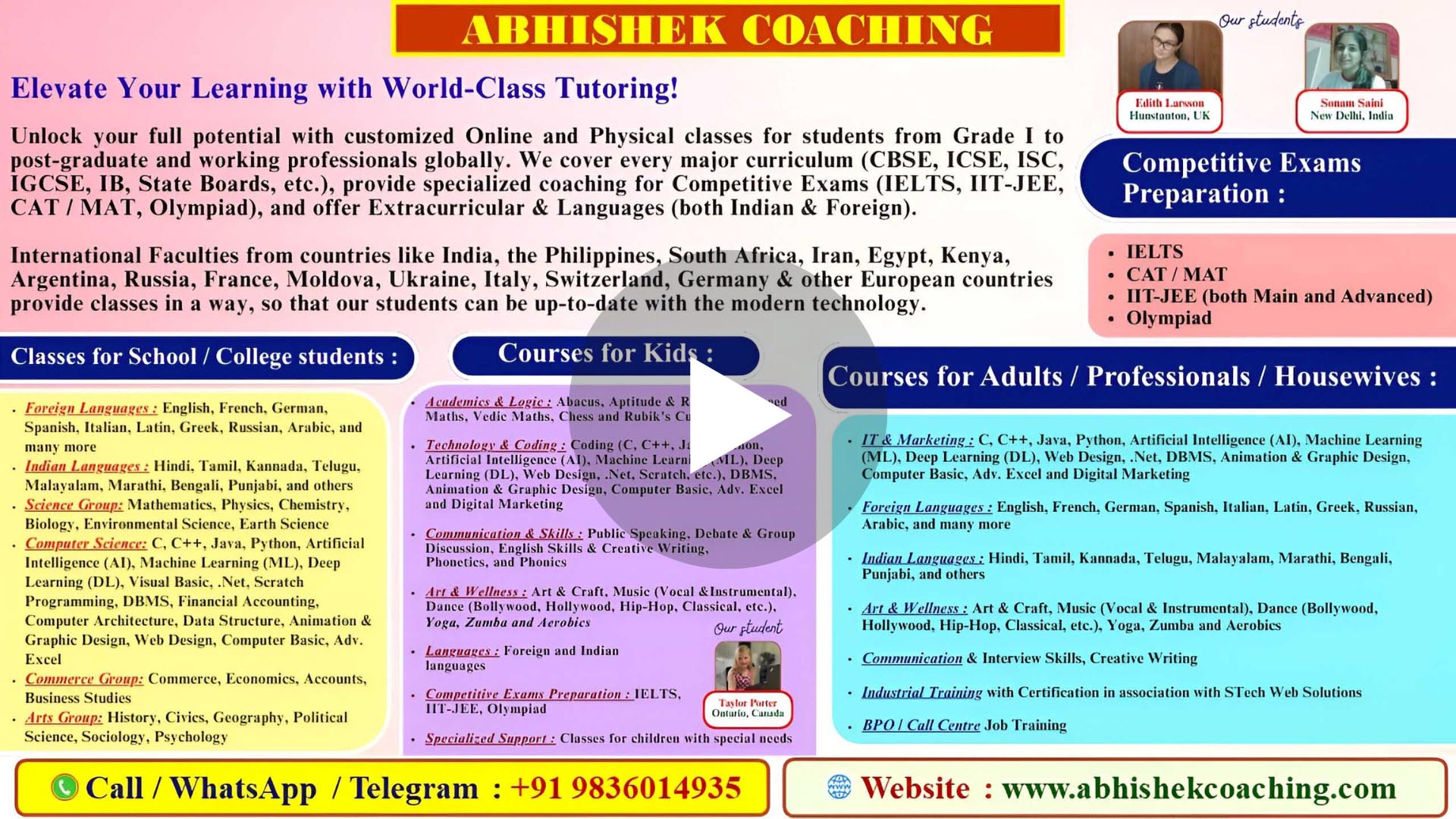 We now provide comprehensive coaching in a vast range of subjects, including Mathematics, Science, IT, Commerce, Arts, and multiple global Languages (French, German, Spanish, Italian, Russian, and many Indian languages), along with Extracurricular for all levels (school, college, and working professionals).